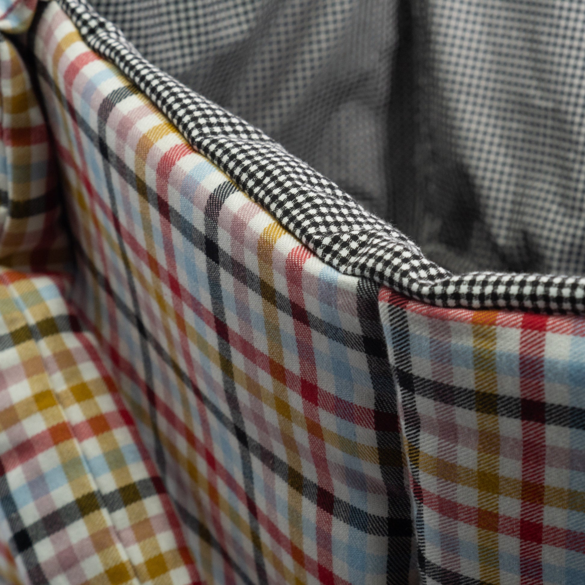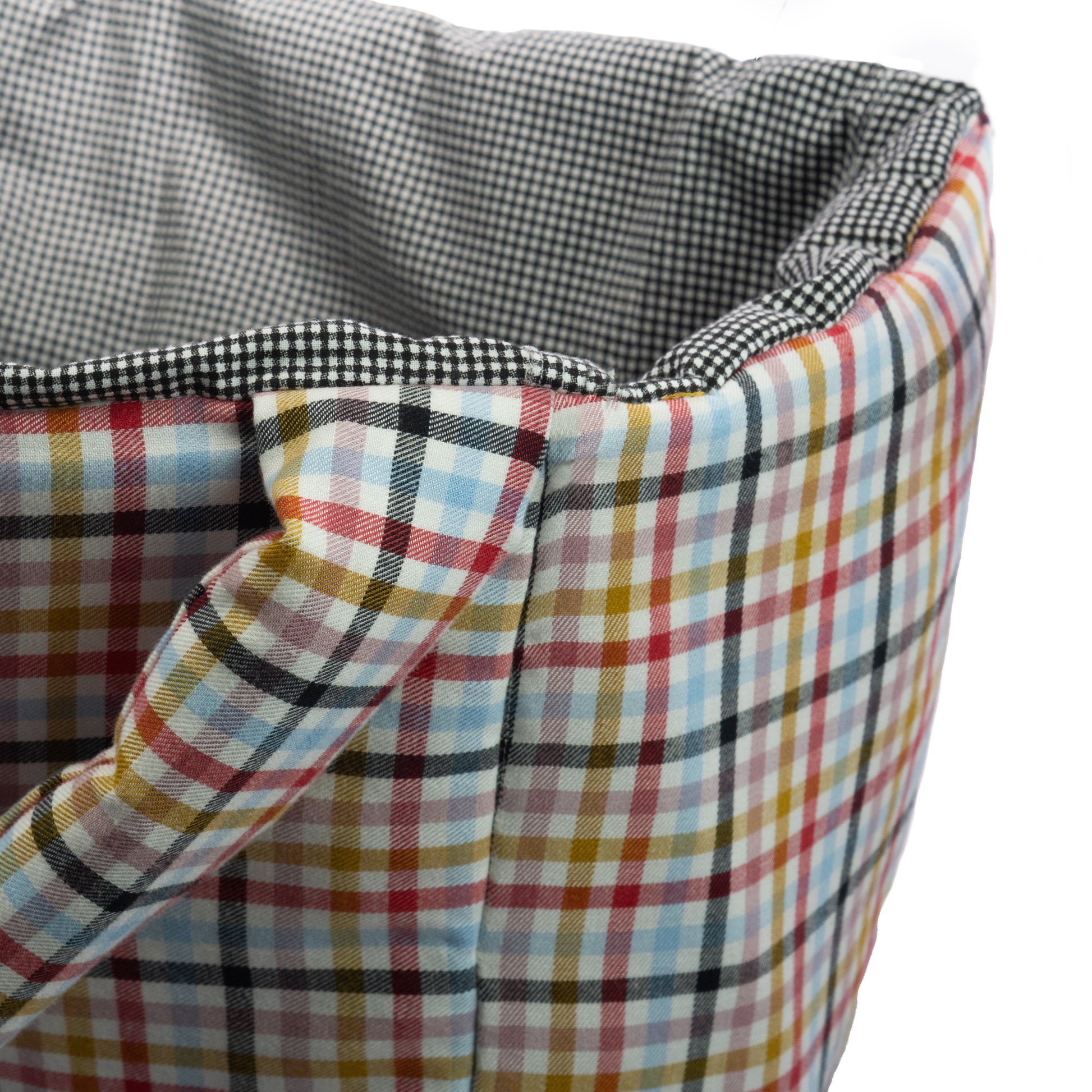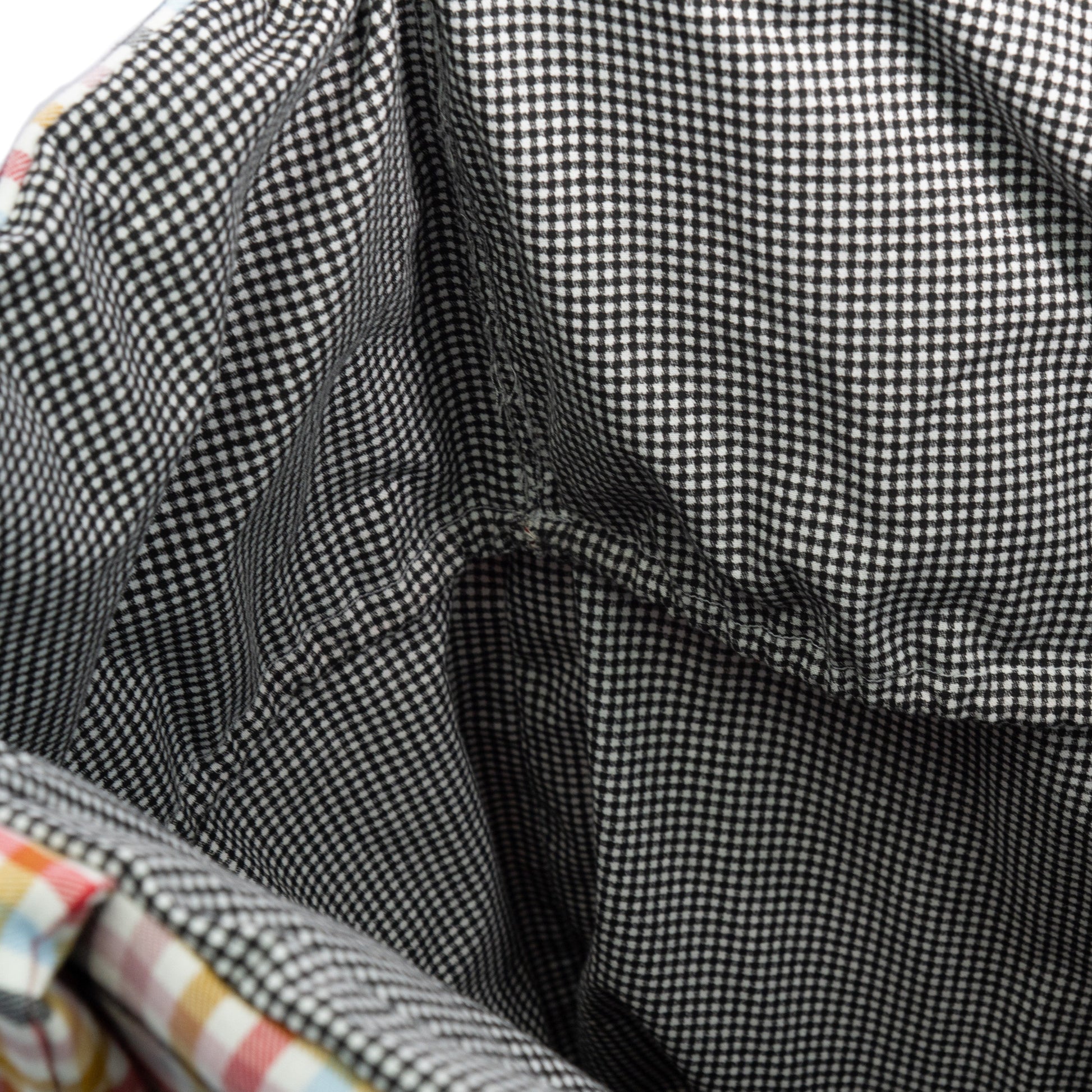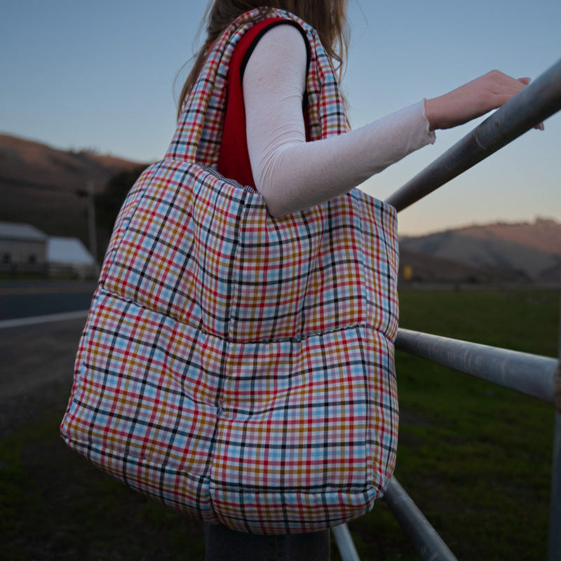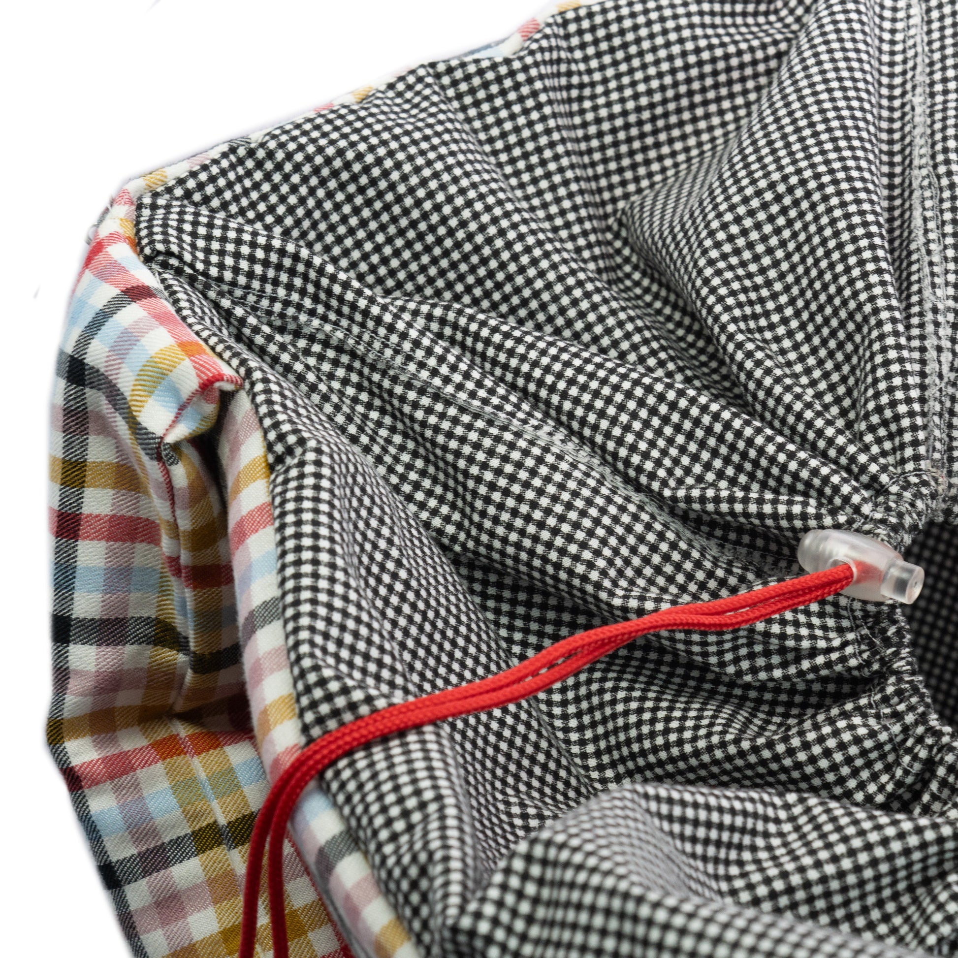 Red, yellow, blue, and black plaid with a gingham lining and a red drawstring for days when you want to cinch things in.
